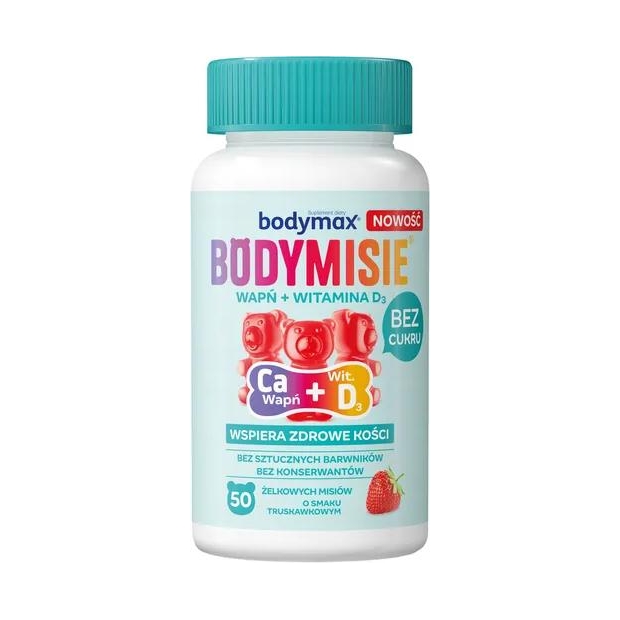 Substancja wypełniająca (syrop maltitolowy), fosforan trójwapniowy, żelatyna (z wieprzowiny), kwas (kwas cytrynowy), naturalny aromat truskawkowy z innymi naturalnymi aromatami, koncentrat z marchwi i czarnej porzeczki, tłuszcz roślinny (kokosowy i rzepakowy), substancja słodząca (sukraloza), substancja powlekająca (wosk carnauba), cholekalcyferol.