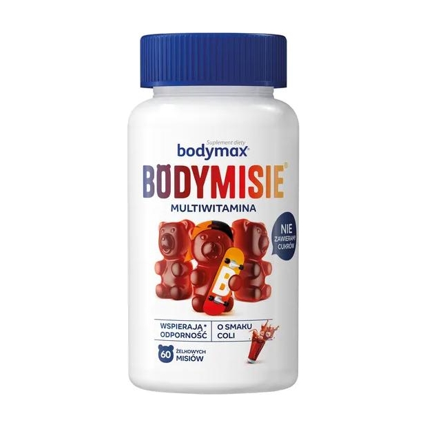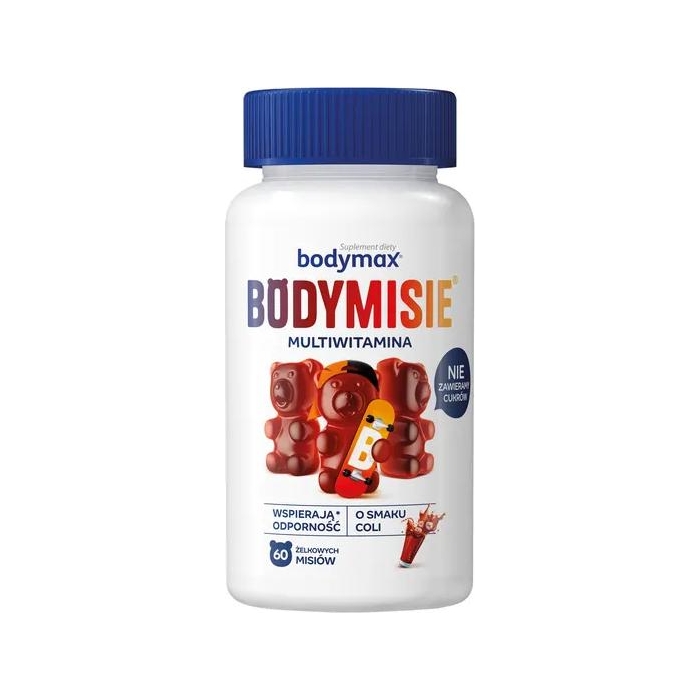 Substancja wypełniająca (maltitole), żelatyna (wieprzowa), kwas L-askorbinowy, regulator kwasowości (kwas cytrynowy), koncentraty jabłka, marchwi i hibiskusa, amid kwasu nikotynowego, octan DL-alfa-tokoferylu, naturalny aromat, średniołańcuchowe trójglicerydy z oleju kokosowego i rzepakowego, substancja słodząca (sukraloza), chlorowodorek pirydoksyny, palmitynian retinylu, kwas pteroilomonogluta- minowy, D-biotyna, substancja glazurująca (wosk carnauba), cholekalcyferol, cyjanokobalamina.